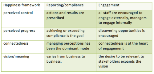 While reporting is a twentieth century practice, stakeholder engagement is of this century. Complying (through reporting) and engaging are diametrically opposed. The former follows prescribed practice while the latter seeks opportunity. Engagement is essentially a communication process and our twentieth century organisations didn’t do that very well. Now we understand communication processes better, and our workplaces feature more diversity (in age, gender, culture and ethnicity) of necessity, we have to learn to engage better. Engagement can thus pursue sustainability aspirations, but also improve communication internally and externally – the stakeholder engagement win-win.