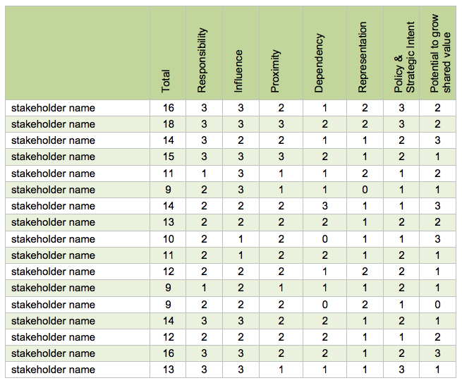 3.   Sort the matrix so stakeholders are ranked with those scoring highest at the top. Use a one-page matrix to consult with your colleagues (any more than one page makes the process too unwieldy). In meetings, conversations and workshops get your colleagues to rank stakeholders to establish a ranking that has broad consensus internally.