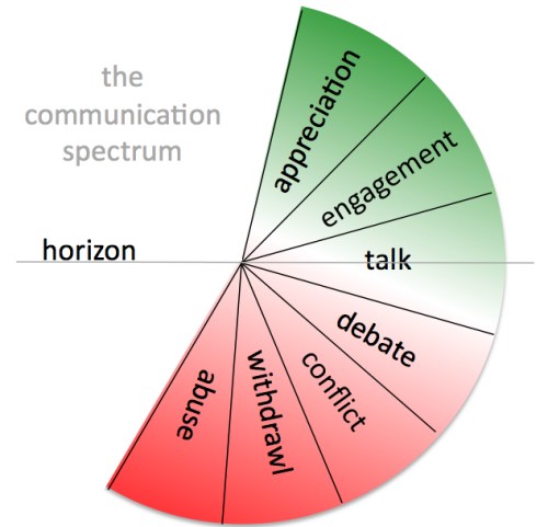 At the top of the spectrum in the green zone are appreciation and engagement. We want more of these for effective communication to foster the development of the important relationships in our lives. Talk is in the neutral range of the spectrum. It can range from the more positive manifestations such as dialogue, (inferring an exchange) through to monologue (inferring communication with a dominant party).