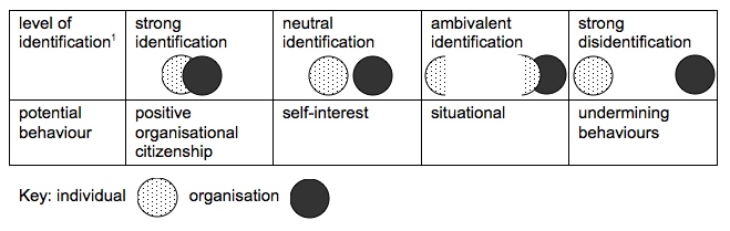 Another dimension of engagement is how staff identify with the organisation. The following diagram illustrates four different types of identification. Some staff as in the second column, will identify strongly with the organisation. Another possibility is ambivalent identification as illustrated in the fourth column; in this situation the staff member identifies strongly with their work team, but not with the organisation itself. An example might be engineers or health clinicians, who identify strongly with their professions, but are disenchanted with the organisation. They might be technically engaged, but not engaged as corporate citizens. Thus, while they are happy in their work, they may not be good ambassadors for the organisation.