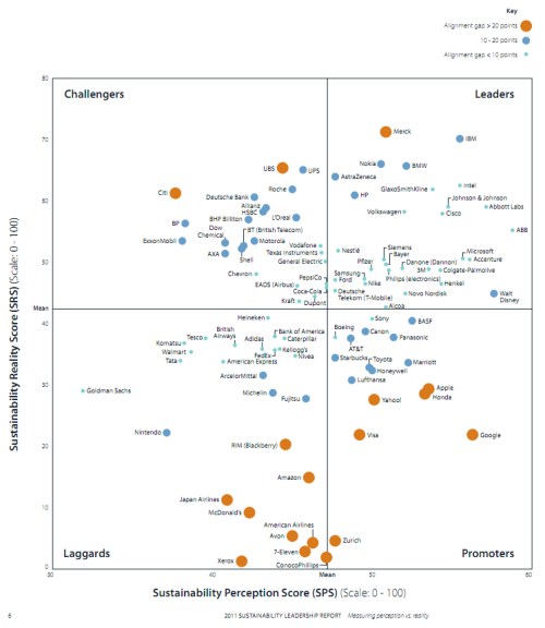 Notice that IBM hits the sweet spot of high sustainability performance and high sustainability perceptions.