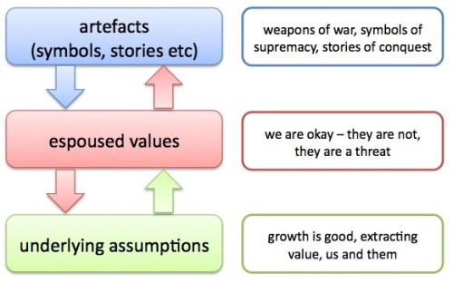 This became the default human experience and patterned behaviours such as displays of dominance, disputes over resources, and ingrained insecurity predominated. Edgar Schein’s model of culture can be applied to this pervasive human culture. At the top level of Schein’s model are artefacts – the artefacts of the age of conquest changed over time, along with the characters in the war stories, but the essence of the stories was the same. As our ancestors replayed the stories over time they ingrained underlying assumptions of what life is all about and reinforced enduring drivers of human behaviour – “growth is good”, “extracting value” and “us and them”. Occasionally, enlightened individuals and movements would emerge but they would typically be usurped by those possibly influenced by the new, but reverting to the old patterns of behaviour.