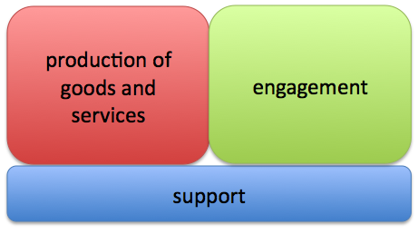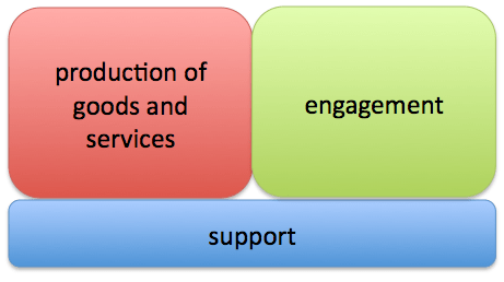 Incrementalism won’t do. I believe we need a rethink of the structure of organisations. As outlined in an earlier post, engagement needs be a core organisational capability.  By organising into three main functions, engagement, production and support, organisations are better equipped to engage with stakeholders. The engagement role can include HR, marketing, customer service and communications. Bundling them together, and heading them with an engagement champion will help to balance the contractual and developmental functions of HR.