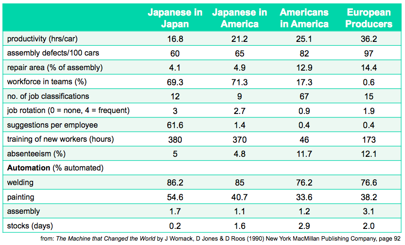 It appears that Japanese companies learned to democratise learning decades ago, while Western companies are still struggling to embed learning processes. The diagram below reveals the extent that learning is embedded in Japanese automobile assembly plants. Note that the suggestions generated by Japanese workers far exceed those from Americans and Europeans. (click on the image for a larger version)