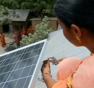This image of a woman in a sari installing a solar panel on a Bangladeshi roof represents sea-change in the lives of rural Bangladeshi women. Opportunities for technical training and benefits generated by the new technologies transform lives. See more about Grameen Shakti in this YouTube video.
