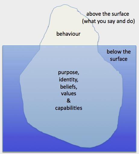 The iceberg metaphor illustrates how behavioural change – the visible part of the iceberg is most effective when there is a shift in the underlying bulk of the iceberg. These submerged elements include values, beliefs and attitudes.